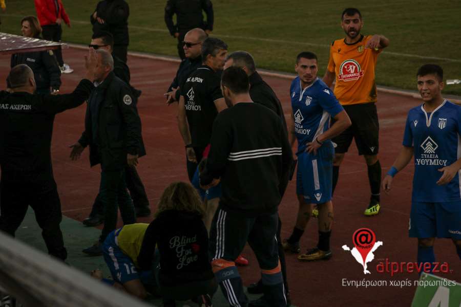 Το ματς διακόπηκε τρεις φορές, είχε συμπλοκές και ξύλο μεταξύ ποδοσφαιριστών, κροτίδα στον πάγκο των φιλοξενούμενων, επίθεση σε φιλάθλους του Αχέροντα, γυναίκες να ζητούν βοήθεια, δύο ποδοσφαιριστές να διακομίζονται στο Νοσοκομείο και έναν άλλο παίκτη να κινδυνεύει να συλληφθεί από την Αστυνομία.