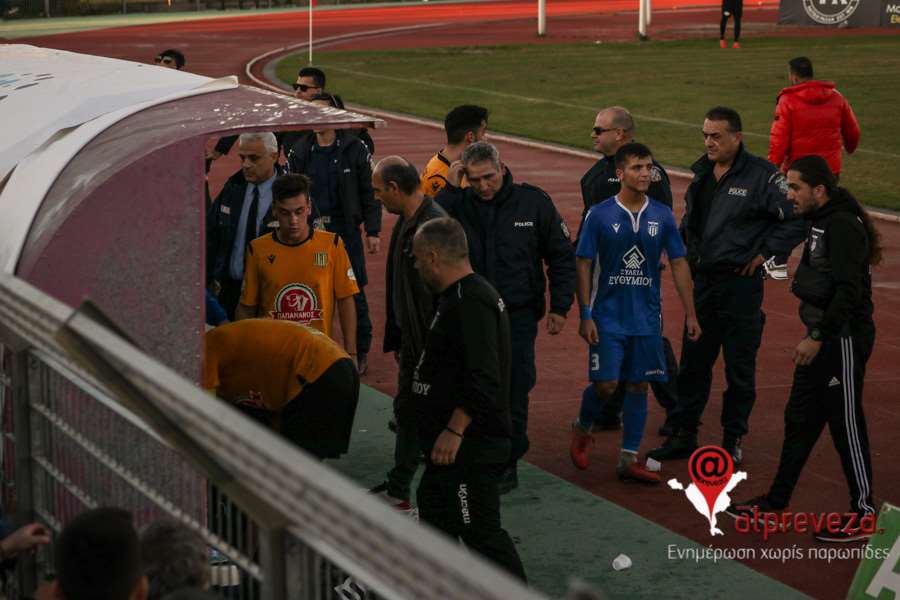 Έπειτα από συστάσεις και την ενίσχυση της αστυνομικής δύναμης στον πάγκο των φιλοξενούμενων, η αναμέτρηση συνεχίστηκε, για να διακοπεί και πάλι στο 84' όταν ο Βασιλειάδης, ο οποίος είχε βγει αλλαγή πέρασε μπροστά από τον πάγκο της Πρέβεζας και συνεπλάκη με ποδοσφαιριστές του ΠΑΣ που κάθονταν στον πάγκο, οι οποίοι του καταλογίζουν πως τους προκάλεσε.