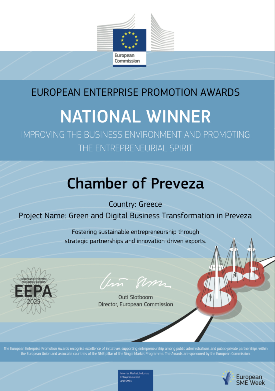 Η διάκριση αυτή αποτελεί επιστέγασμα των συστηματικών και πολυεπίπεδων παρεμβάσεων του Επιμελητηρίου για τη στήριξη της επιχειρηματικότητας, την ενίσχυση της εξωστρέφειας και τη δημιουργία ενός δυναμικού, βιώσιμου και καινοτόμου επιχειρηματικού οικοσυστήματος στον Νομό Πρέβεζας.