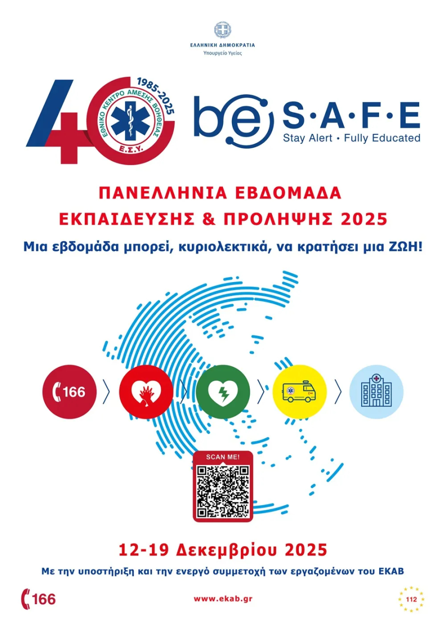 Η Πανελλήνια Εβδομάδα Εκπαίδευσης & Πρόληψης 2025 - ΕΚΑΒ be S.A.F.E. υλοποιείται από το Τμήμα Εκπαίδευσης του ΕΚΑΒ, σε συνεργασία με τοπικούς και περιφερειακούς φορείς, και εντάσσεται στο ευρύτερο εκπαιδευτικό και κοινωνικό έργο του Οργανισμού.