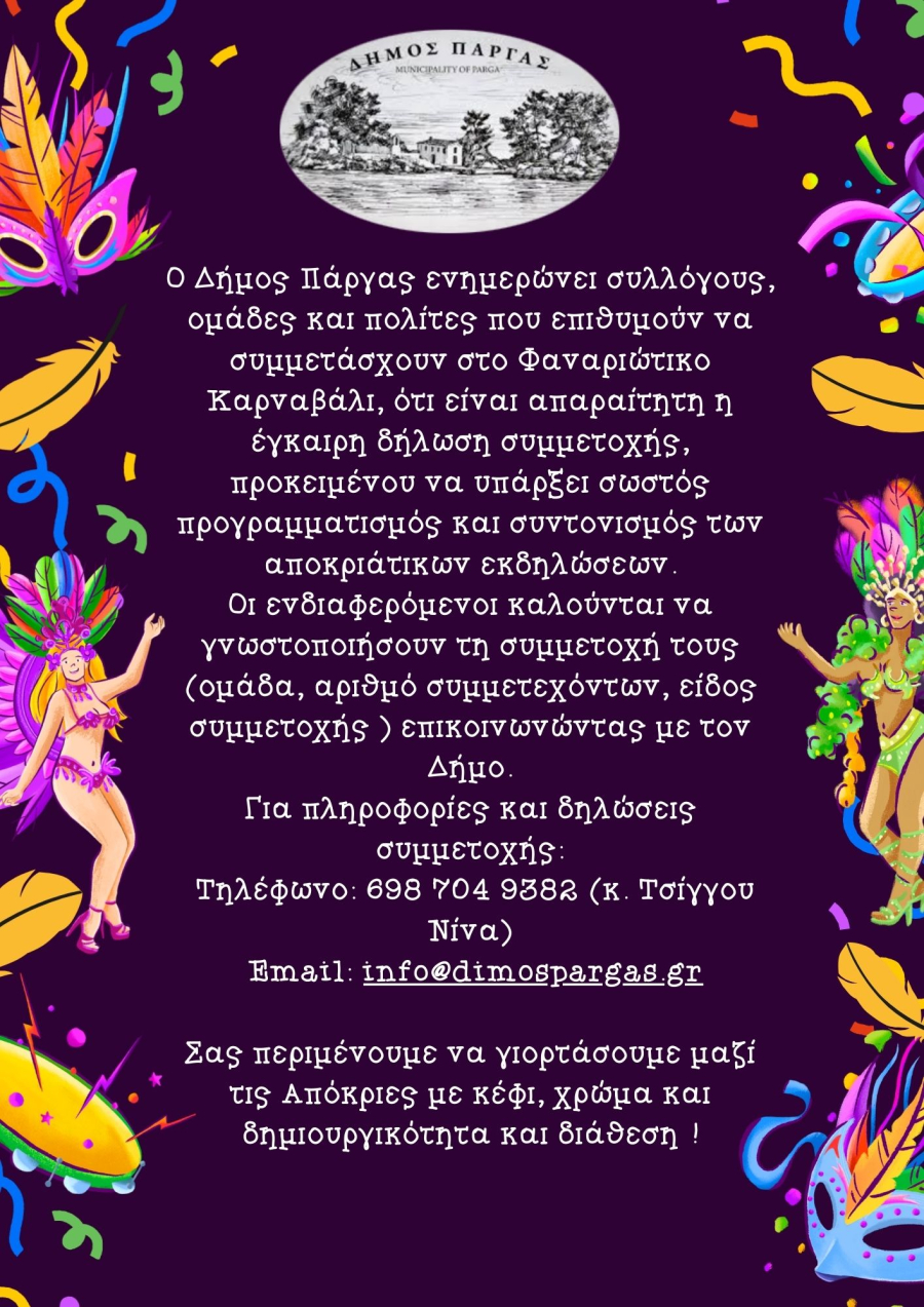 "Η συνεργασία όλων είναι απαραίτητη για την επιτυχή διοργάνωση του καρναβαλιού και τη δημιουργία ενός χαρούμενου και ασφαλούς αποκριάτικου κλίματος για μικρούς και μεγάλους. Σας περιμένουμε να γιορτάσουμε μαζί τις Απόκριες με κέφι, χρώμα και δημιουργικότητα!" τονίζει ο δήμος στην ανακοίνωσή του.