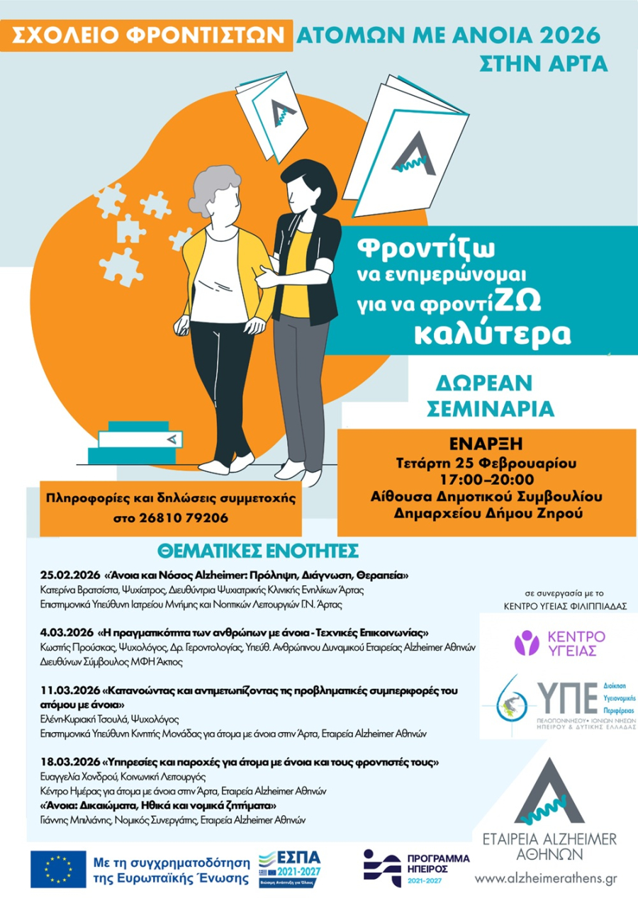 Η δεύτερη συνάντηση του εκπαιδευτικού κύκλου θα πραγματοποιηθεί αύριο στη Φιλιππιάδα, με θέμα: «Η πραγματικότητα των ανθρώπων με άνοια - Τεχνικές Επικοινωνίας».