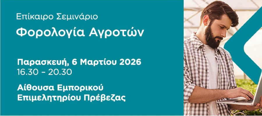 Το σεμινάριο θα πραγματοποιηθεί σήμερα Παρασκευή, 6 Μαρτίου και ώρα 16.30 – 20.30, στην αίθουσα του Εμπορικού Επιμελητηρίου Πρέβεζας.